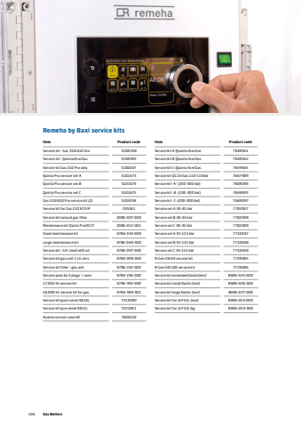 Item Product codeService kit %u2013 Gas 310/610 Eco S100198Service kit %u2013 Quinta/Eco/Gas S100493Service kit Gas 210 Pro only S100637Quinta Pro service set A S101673Quinta Pro service set B S101674Quinta Pro service set C S101675Gas 310/610 Pro service kit (2) S103294Service kit for Gas 210 ECO M S55561Service kit natural gas filter 2086-007-000Maintenance kit Dachs Pro20 ST 2086-012-001Small maintenance kit 4786-042-000Large maintenance kit 4786-046-000Service kit %u2013 G/F small W/O oil 4786-097-000Service kit gas unit 1 LG serv 4786-098-000Service kit filter %u2013 gas unit 4786-232-000Service pack 6x S plugs + conn 4786-236-00017,500-Hr service kit 4786-393-00018,000-Hr service kit for gas 4786-589-001Service kit (post serial 0616) 7219280Service kit (pre serial 0615) 7221851Avanta service case UK 7600102Remeha by Baxi service kitsItem Product codeService kit A (Quinta Ace/Gas 7649561Service kit B (Quinta Ace/Gas 7649562Service kit C (Quinta Ace/Gas 7649563Service kit Q115/Gas 110-115kW 7667989Service kit -A- (200-300 kW) 7669093Service kit -B- (200-300 kW) 7669095Service kit -C- (200-300 kW) 7669097Service set A 30-45 kW 7702097Service set B 30-45 kW 7702098Service set C 30-45 kW 7702099Service set A 55-115 kW 7710047Service set B 55-115 kW 7710048Service set C 55-115 kW 7710049R-Gen 20/44 service kit 7729085R-Gen 50/100 service kit 7729086Service kit extended DachsGen2 8086-035-000Service kit small Dachs Gen2 8086-036-000Service kit large Dachs Gen2 8086-037-000Service kit for G/F3.0, small 8086-053-000Service kit for G/F3.0, big 8086-054-000106 Gas Boilers
